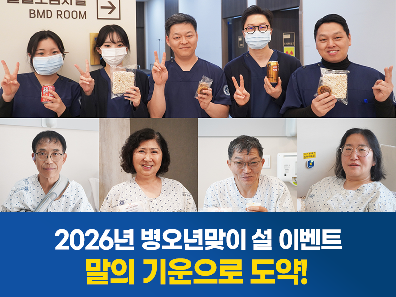 평택우리병원 2026 병오년 설맞이 이벤트, 말의 기운으로 도약! 평택우리병원 0 02.13 18:00 안녕하세요. 평택우리병원입니다.2026 병오년을 맞아 설맞이 이벤트를 준비했는데요.이번 설날은 붉은 말의 기운을 받아 ????뜨겁고 힘찬 에너지로 ????올 한 해를 도약할 수 있도록진행해보았습니다.설맞이 전통간식과환자분들을 위한 '뽑기'게임,직원분들을 위한 '말공던지기'와 '스톱워치'게임이 이루어졌습니다.붉은 말의 힘찬 기운처럼여러분의 성장과 도약을 평택우리병원이 응원합니다.❤️새해 복 많이 받으세요! ❤️