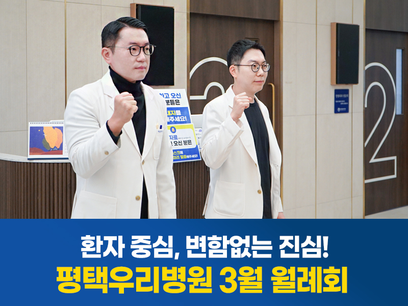 환자 중심, 변함없는 진심! 평택우리병원 3월 월례회 평택우리병원 0 11시간전 안녕하세요.평택우리병원입니다. 어느덧 봄의 문턱이성큼 다가온 3월이 시작되었습니다. 새로운 계절의 문턱에서 다시 한 번 마음을 다잡는3월 월례회가 진행되었습니다.“환자 중심, 변함없는 진심.”으로 정확하고, 정직한 진료 작은 배려 하나, 따뜻한 설명 한 마디, 신속한 협진과 책임 있는 대응으로 환자에게는 ‘믿고 찾을 수 있는 병원’이라는 이름으로 함께 하겠습니다. 이번 달도 함께 힘을 모아 더 단단하고 더 따뜻한 병원을 만들어가겠습니다. 감사합니다.